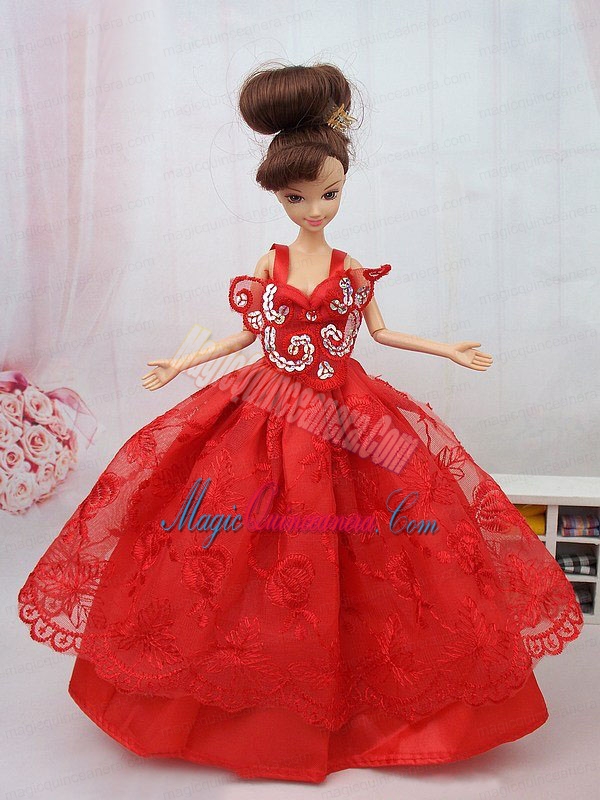 New Beautiful Ball Gown Red Lace Handmade Party Clothes Fashion Dress for Noble Barbie