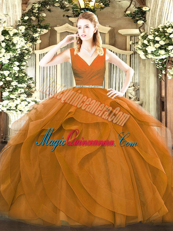New Style Brown Ball Gowns Tulle V-neck Sleeveless Beading and Ruffles Floor Length Zipper Sweet 16 Dress - Magic Quinceanera