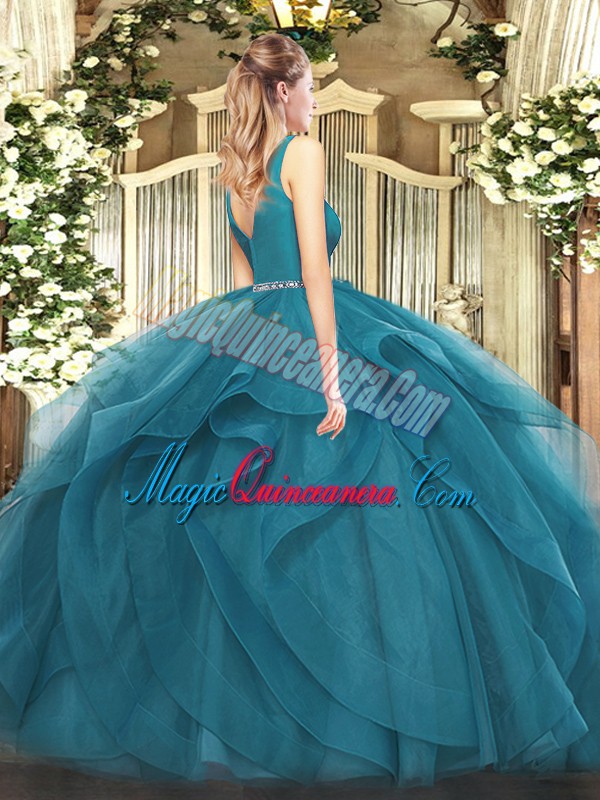 New Style Brown Ball Gowns Tulle V-neck Sleeveless Beading and Ruffles Floor Length Zipper Sweet 16 Dress