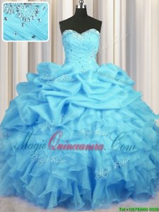 New Style Floor Length Baby Blue Quinceanera Dresses Organza Sleeveless Beading and Ruffles and Ruching and Pick Ups