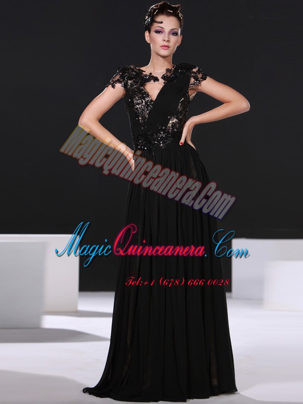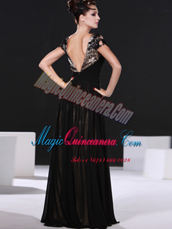 , New Style Floor Length Black Prom Gown Scoop Cap Sleeves Backless