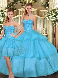 Nice Aqua Blue Three Pieces Organza Sweetheart Sleeveless Beading and Ruffled Layers Floor Length Lace Up Quinceanera Gown