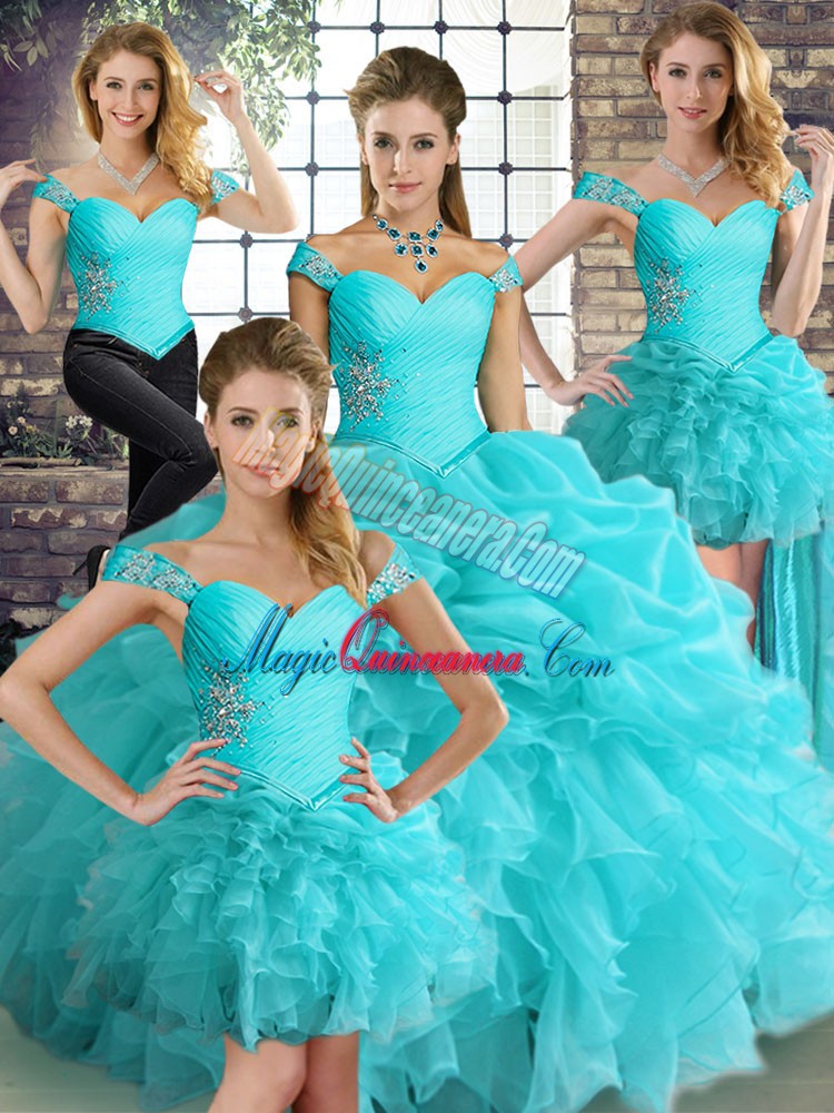 Nice Floor Length Aqua Blue 15th Birthday Dress Off The Shoulder Sleeveless Lace Up