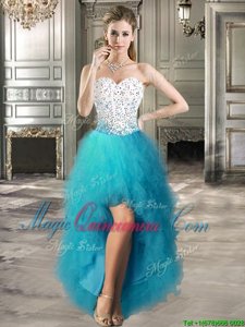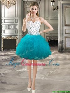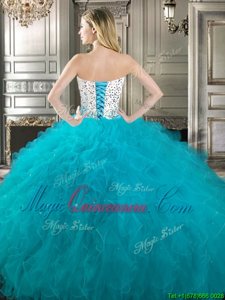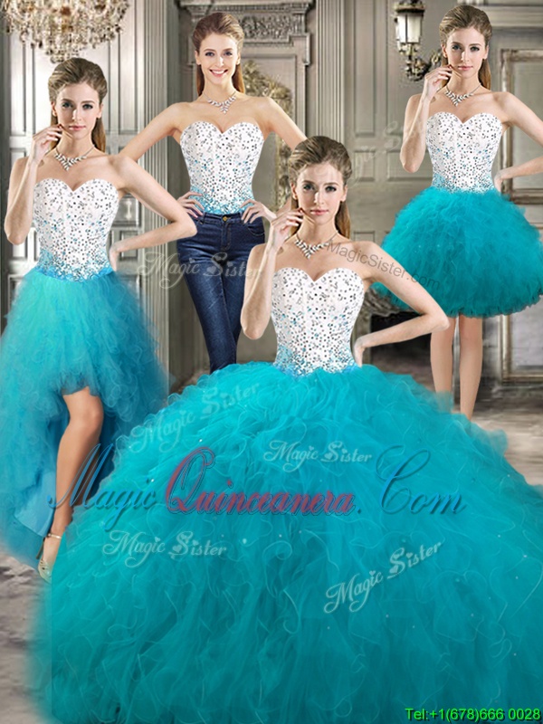 Four Piece Sweetheart Sleeveless Quinceanera Dresses Floor Length Beading and Ruffles Teal Tulle