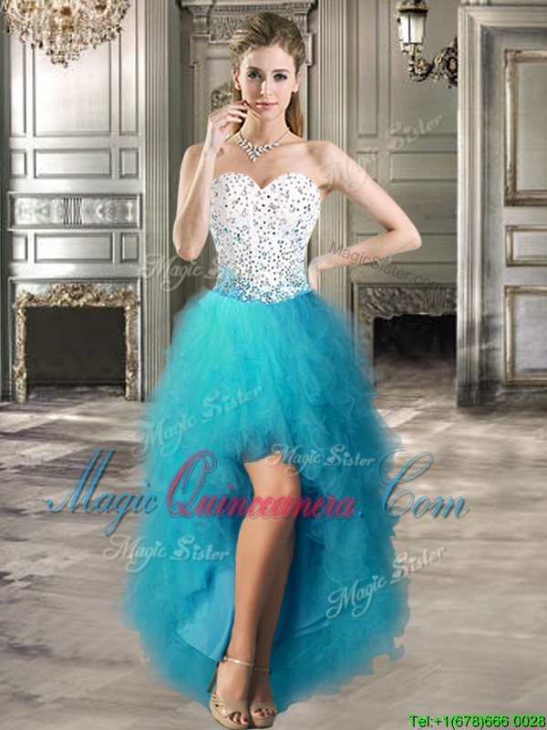 Nice Four Piece Sleeveless Floor Length Beading and Ruffles Lace Up Quinceanera Gown with White and Teal