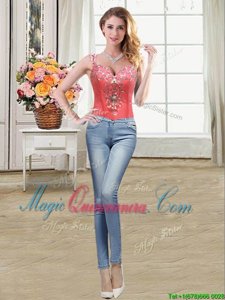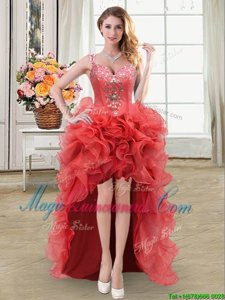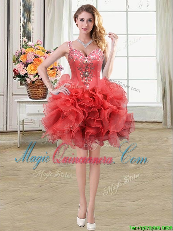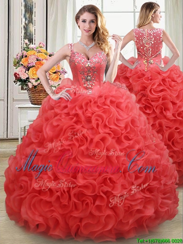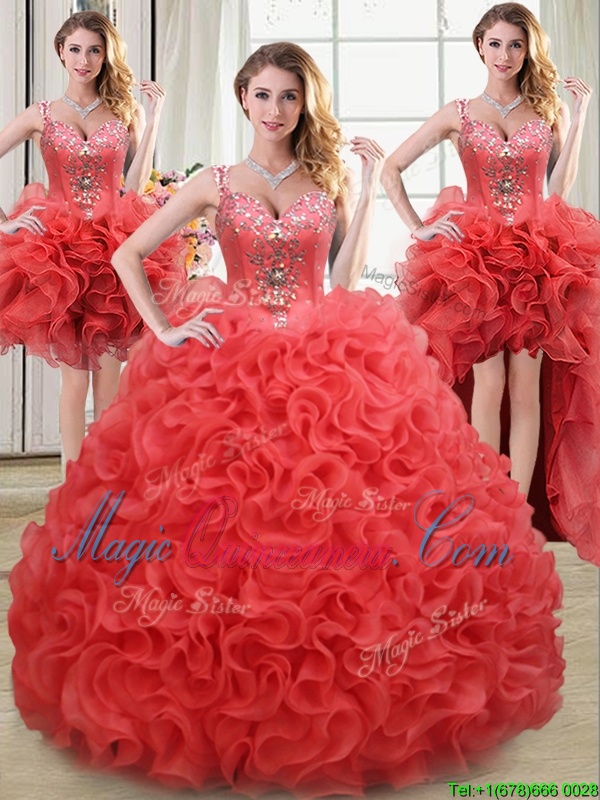 Nice Four Piece Straps Straps Coral Red Sleeveless Floor Length Beading and Ruffles Zipper Sweet 16 Dress