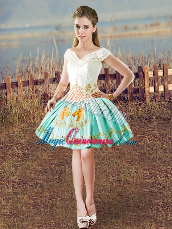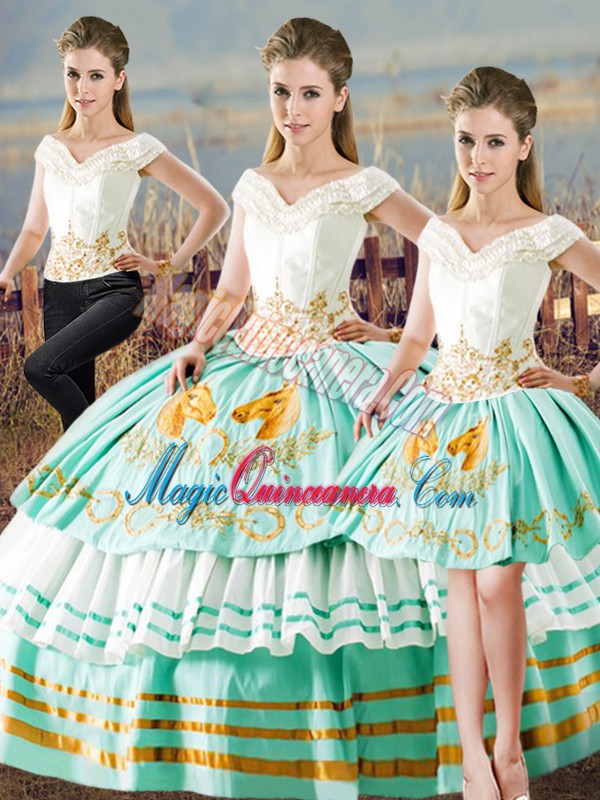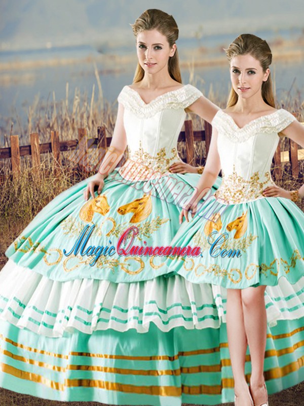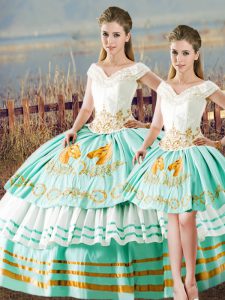 Noble Apple Green V-neck Neckline Embroidery and Ruffled Layers Quince Ball Gowns Sleeveless Lace Up