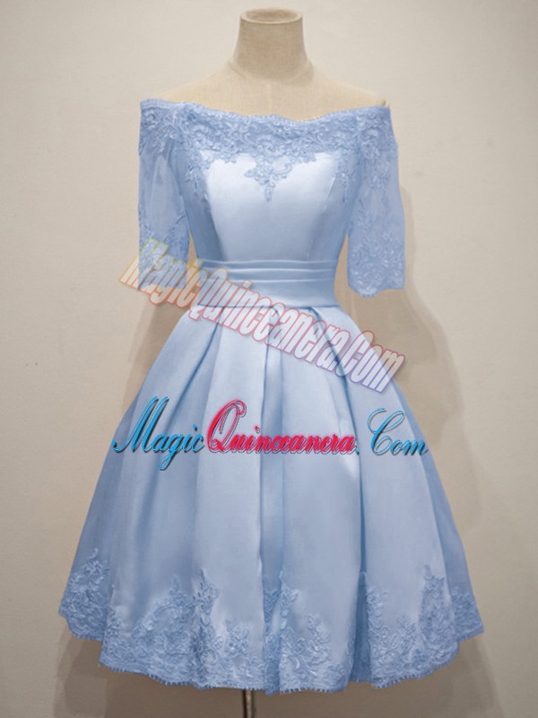 Off The Shoulder Half Sleeves Quinceanera Court of Honor Dress Knee Length Lace Light Blue Taffeta