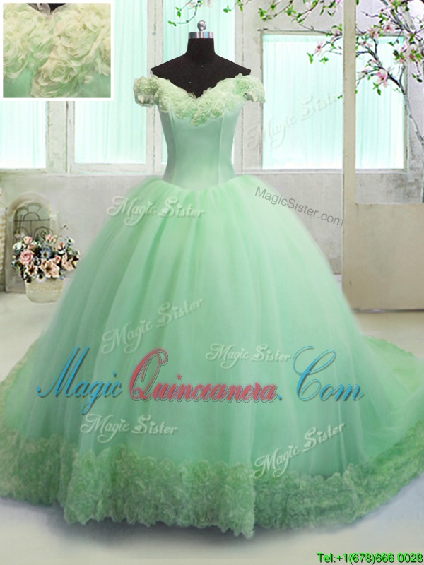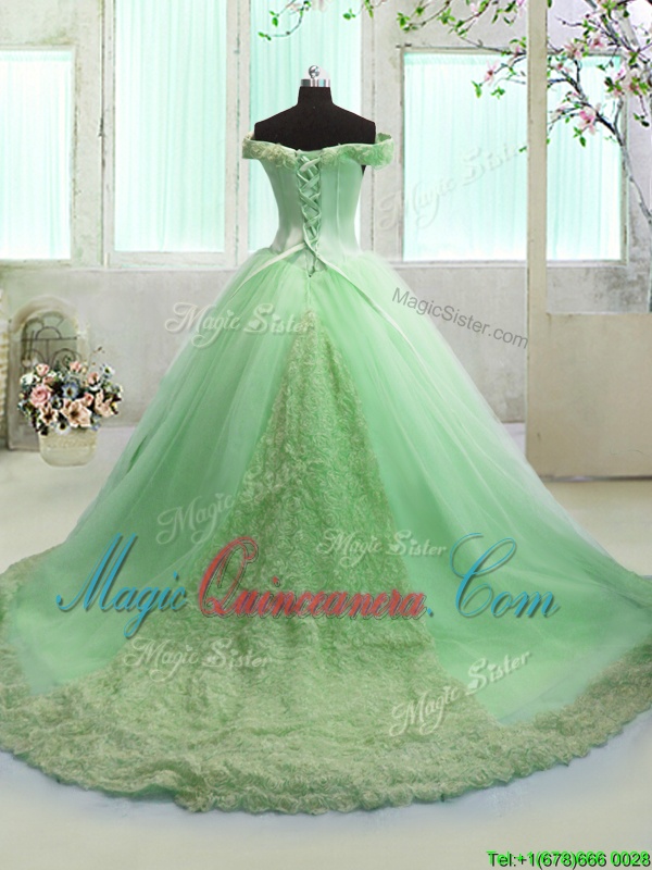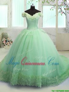 Off The Shoulder Lace Up Hand Made Flower 15th Birthday Dress Court Train Short Sleeves