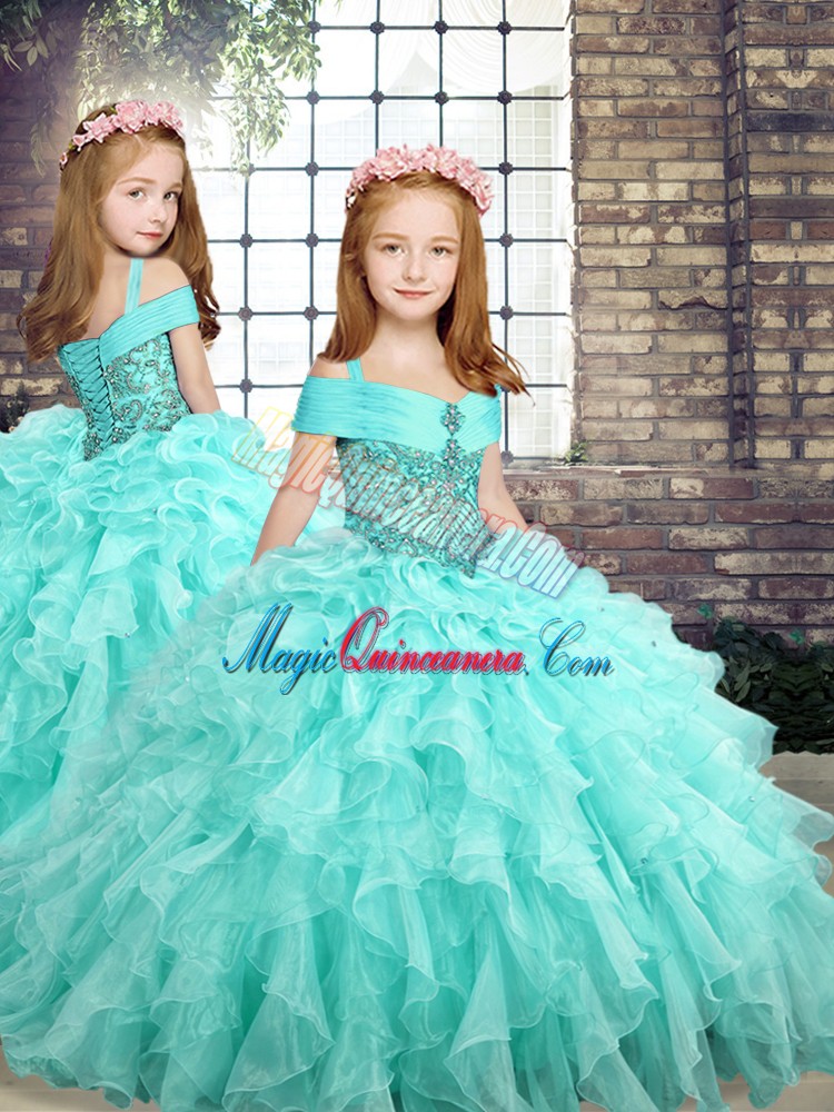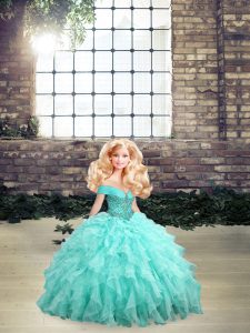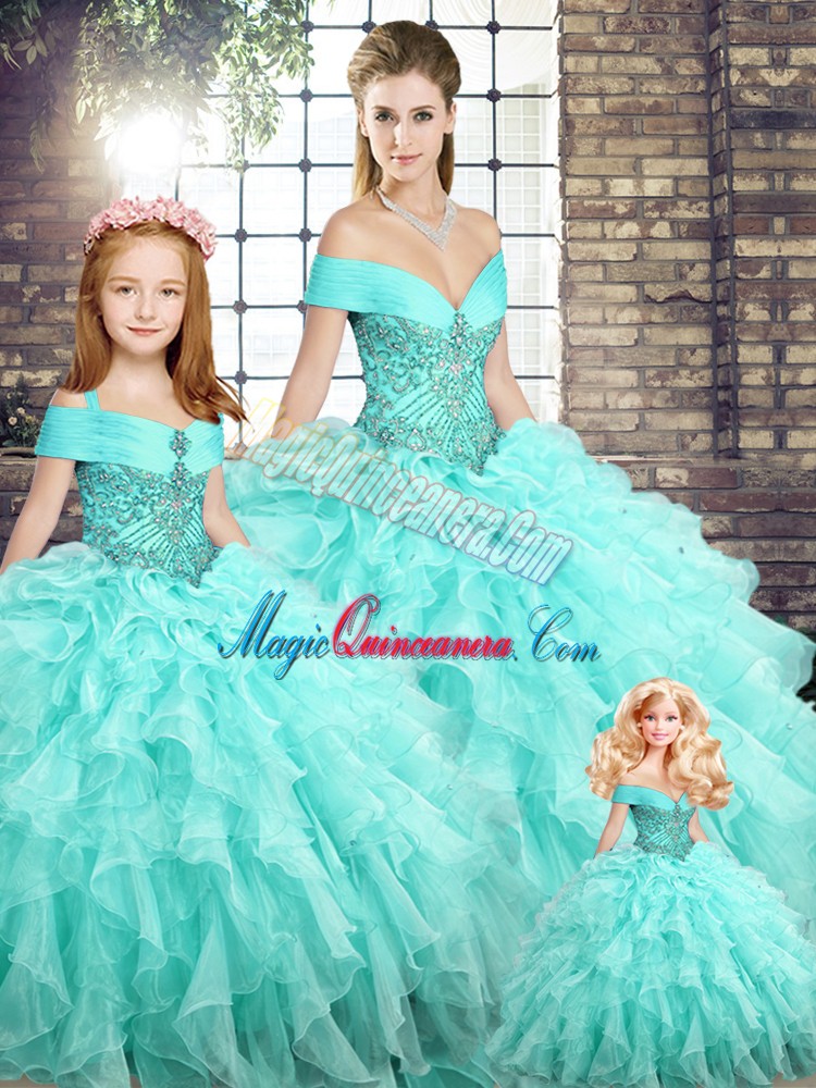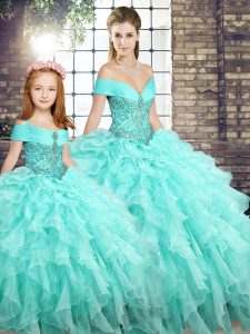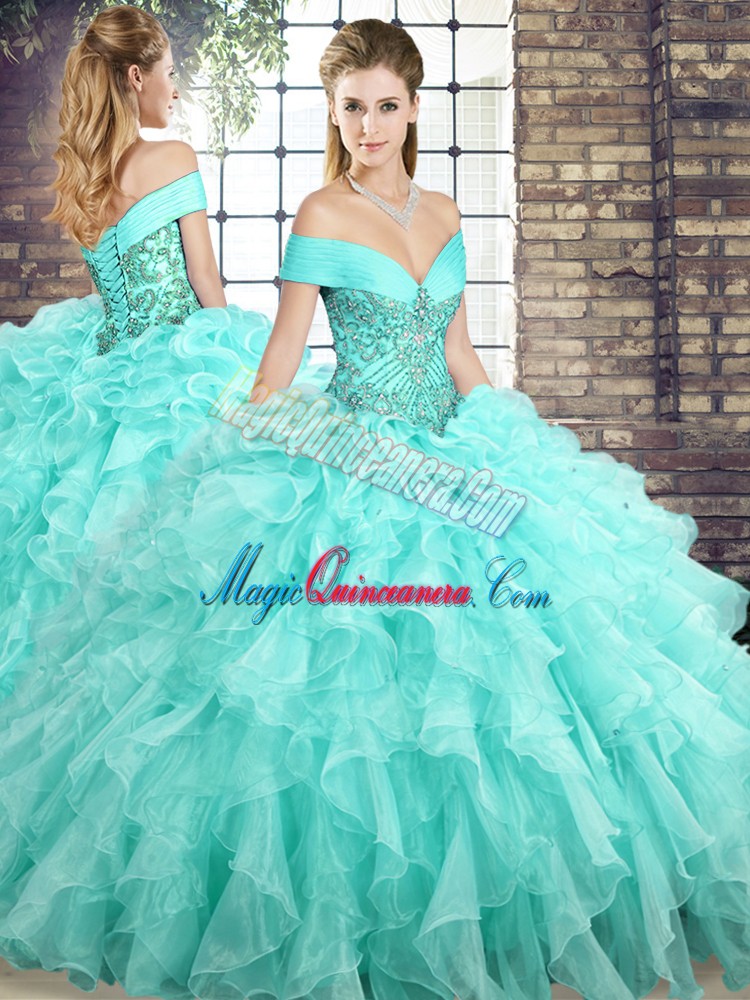 Off The Shoulder Sleeveless 15th Birthday Dress Brush Train Beading and Ruffles Aqua Blue Organza