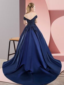 Off The Shoulder Sleeveless Court Train Zipper Sweet 16 Dresses Blue Satin