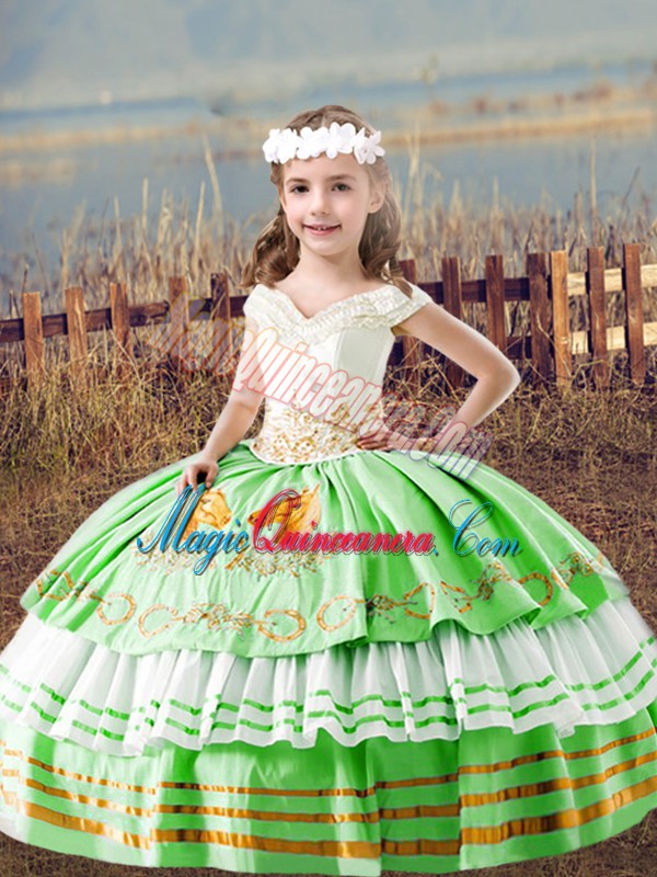 Off The Shoulder Sleeveless Kids Formal Wear Floor Length Embroidery Satin