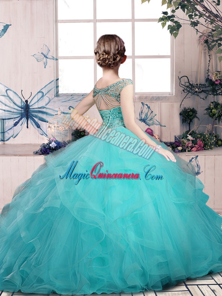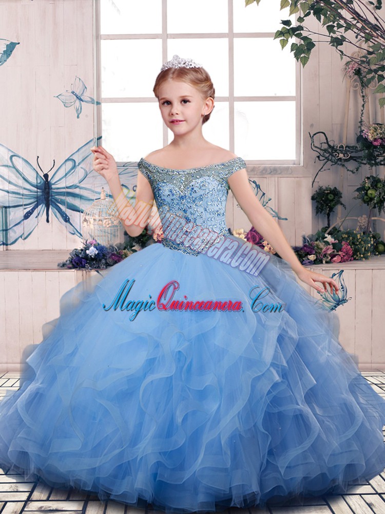Off The Shoulder Sleeveless Lace Up Kids Pageant Dress Blue Tulle