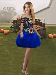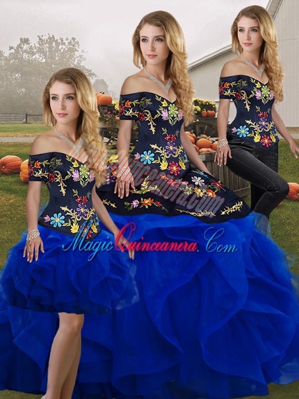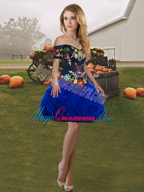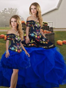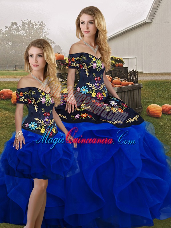 Off The Shoulder Sleeveless Quinceanera Dress Floor Length Embroidery and Ruffles Royal Blue Tulle