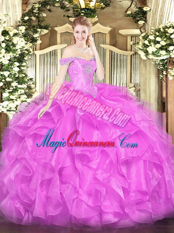 Off The Shoulder Sleeveless Quinceanera Dresses Floor Length Beading and Ruffles Lilac Organza
