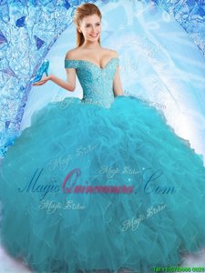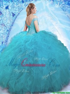 Off the Shoulder Teal Sleeveless Beading and Ruffles Floor Length Sweet 16 Dresses
