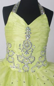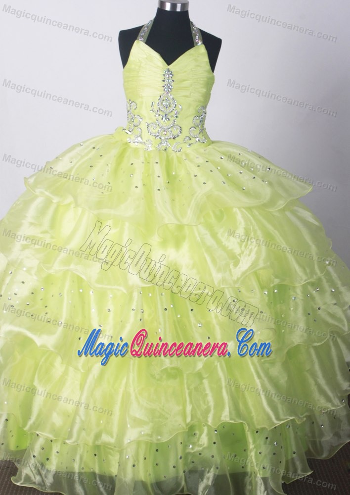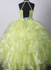 halter floor length little girls formal dresses, Ohio Yellow Green Kid Pageant Dresses With Beading and Ruffled Layers