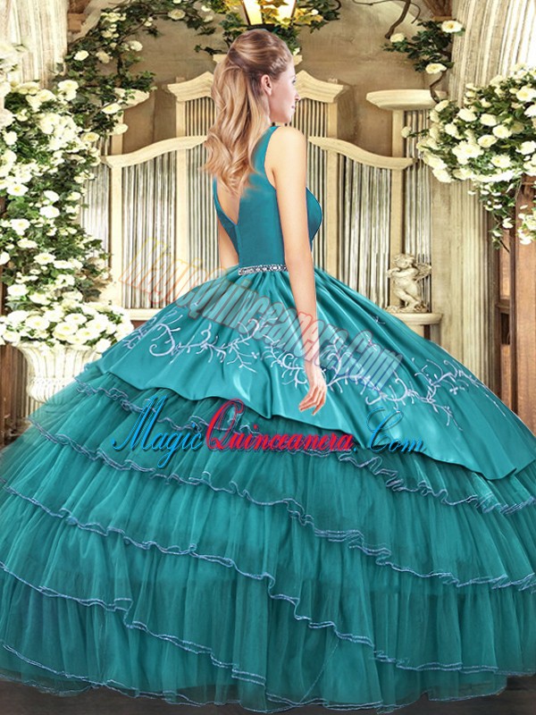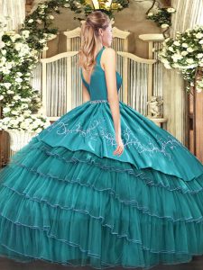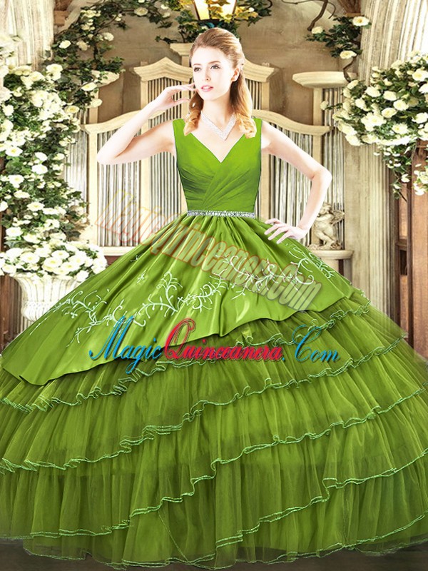 Olive Green Ball Gowns V-neck Sleeveless Satin and Organza Floor Length Zipper Embroidery and Ruffled Layers 15th Birthday Dress