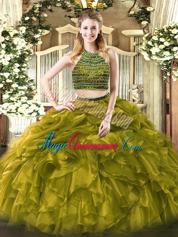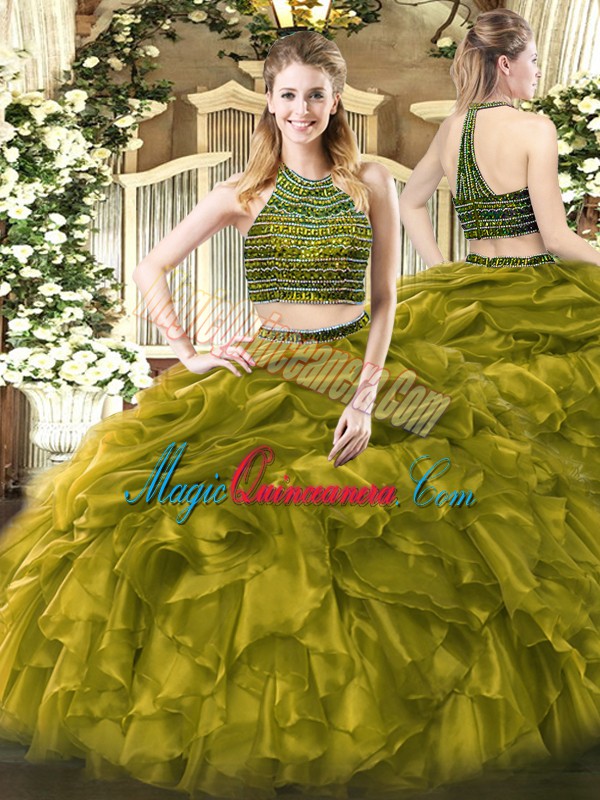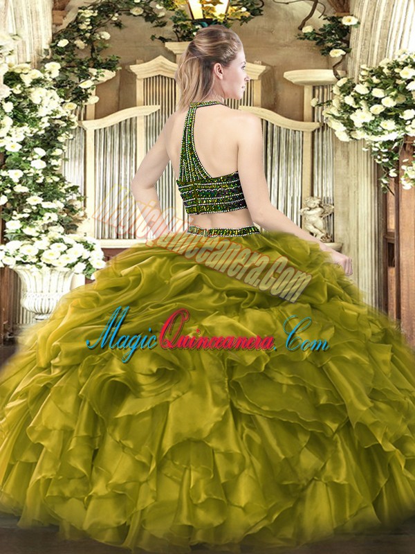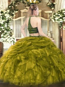 Olive Green Halter Top Neckline Beading and Ruffles 15th Birthday Dress Sleeveless Zipper