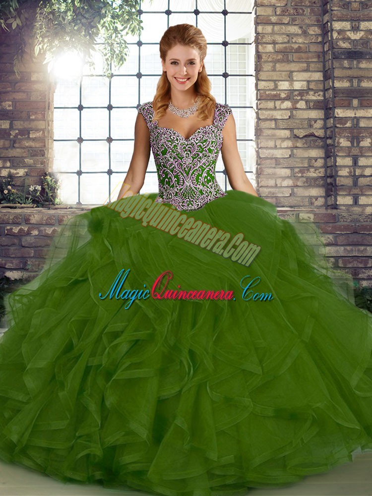 Olive Green Lace Up Quince Ball Gowns Beading and Ruffles Sleeveless Floor Length