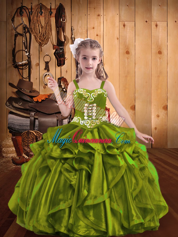 Olive Green Lace Up Straps Embroidery and Ruffles Little Girl Pageant Dress Organza Sleeveless