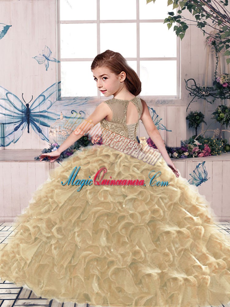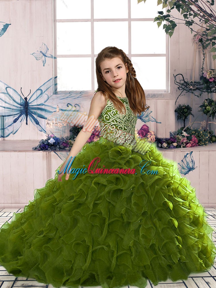 Olive Green Organza Lace Up Little Girls Pageant Dress Wholesale Sleeveless Floor Length Beading and Ruffles