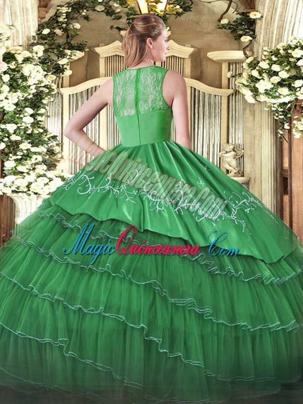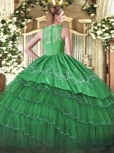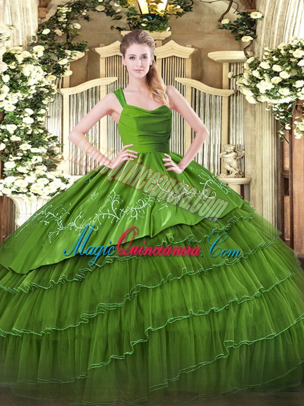 Olive Green Satin and Organza Zipper 15 Quinceanera Dress Sleeveless Floor Length Ruffled Layers