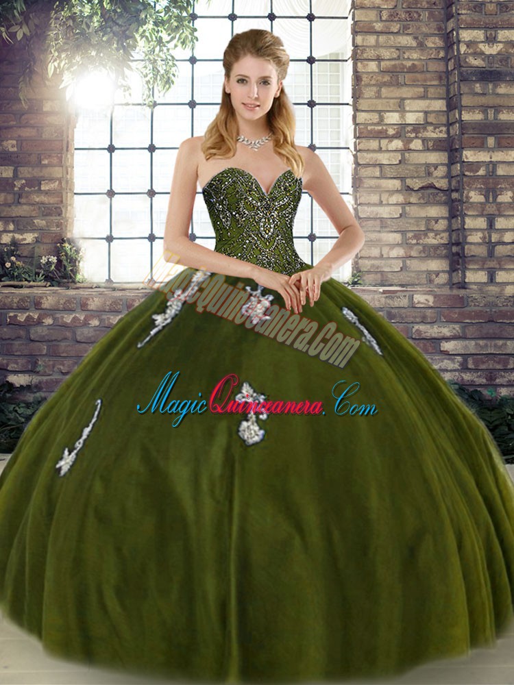Olive Green Sweetheart Lace Up Beading and Appliques Sweet 16 Quinceanera Dress Sleeveless