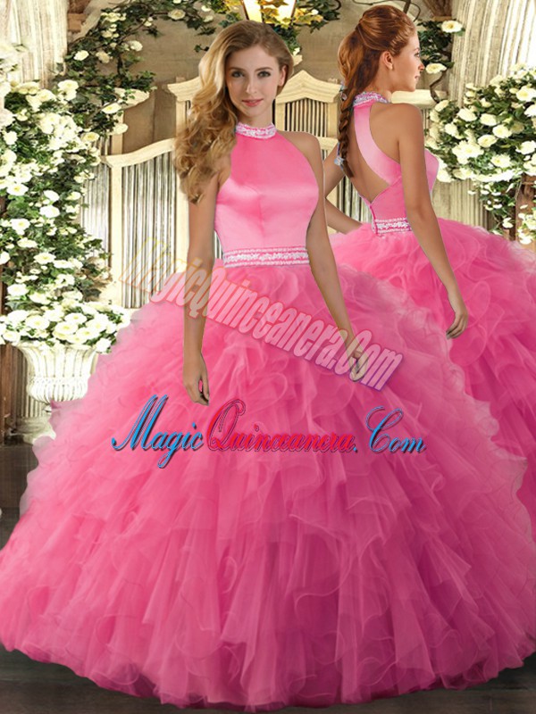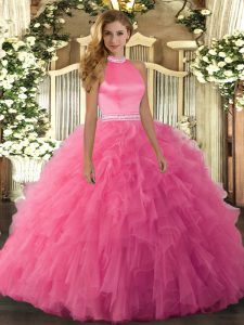On Sale Hot Pink Halter Top Backless Beading and Ruffles Sweet 16 Dresses Sleeveless