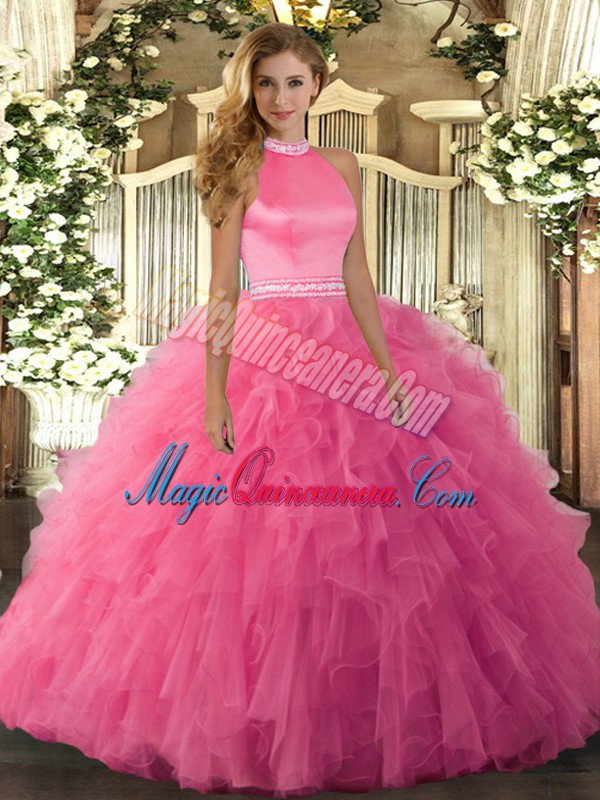 , On Sale Hot Pink Halter Top Backless Beading and Ruffles Sweet 16 Dresses Sleeveless