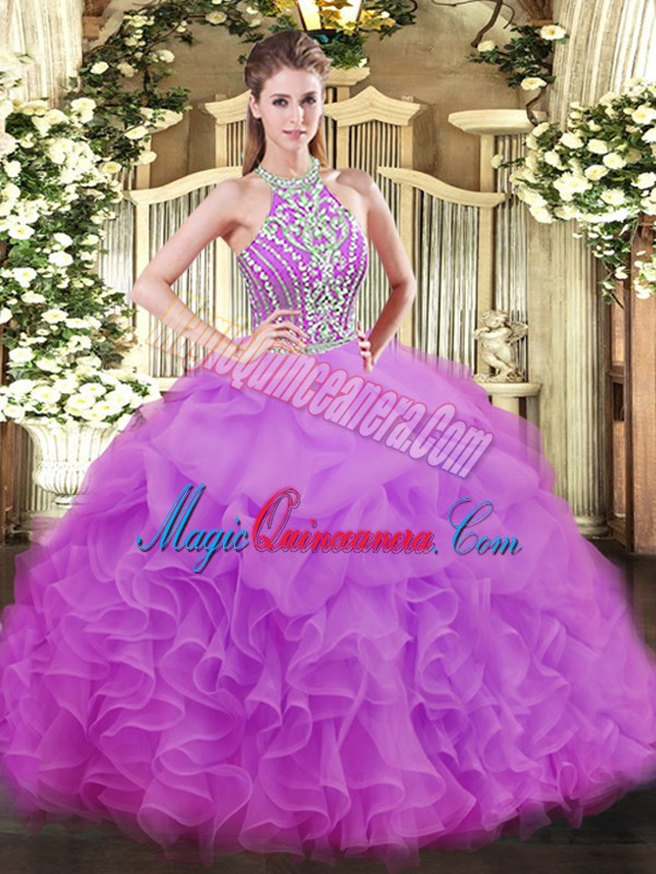 On Sale Lilac Tulle Lace Up Halter Top Sleeveless Floor Length Quinceanera Dress Beading and Ruffles