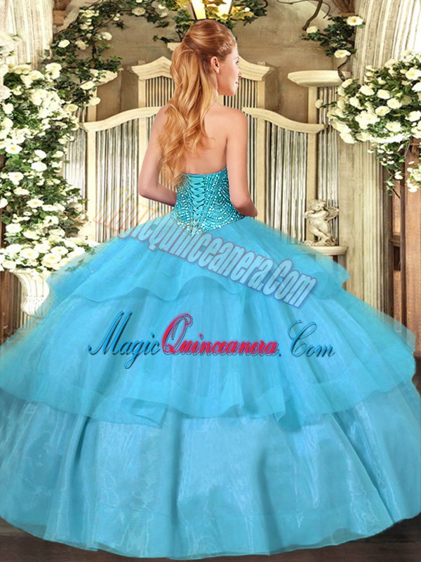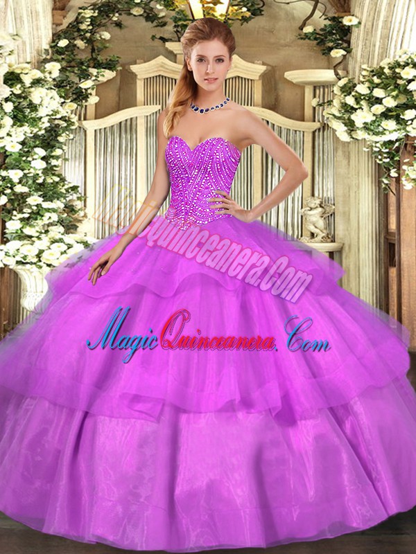 On Sale Lilac Tulle Lace Up Sweet 16 Dress Sleeveless Floor Length Beading and Ruffled Layers
