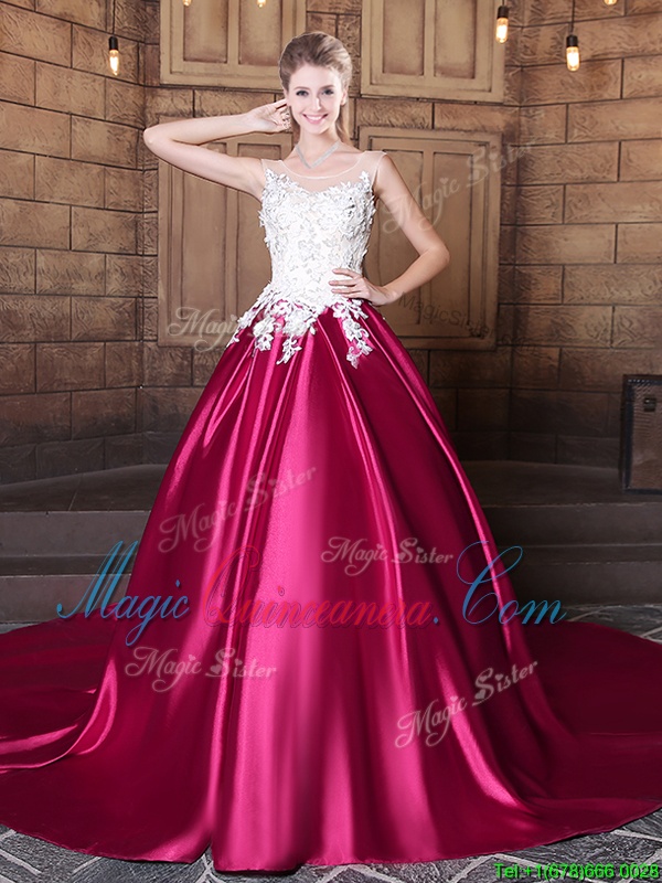 On Sale Scoop Sleeveless Court Train Lace Up Quinceanera Gown Hot Pink Elastic Woven Satin