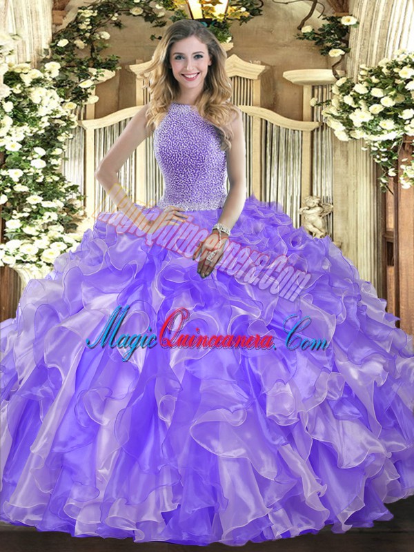 On Sale Sleeveless Organza Floor Length Lace Up Ball Gown Prom Dress in Lavender with Beading and Ruffles
