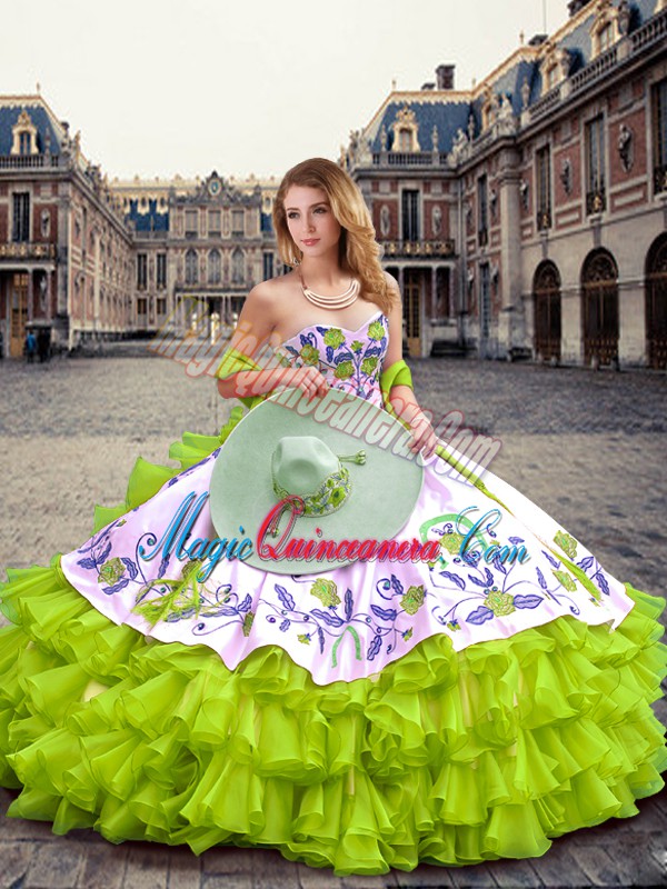 On Sale Yellow Green Ball Gowns Organza Sweetheart Sleeveless Embroidery and Ruffled Layers Floor Length Lace Up 15 Quinceanera Dress