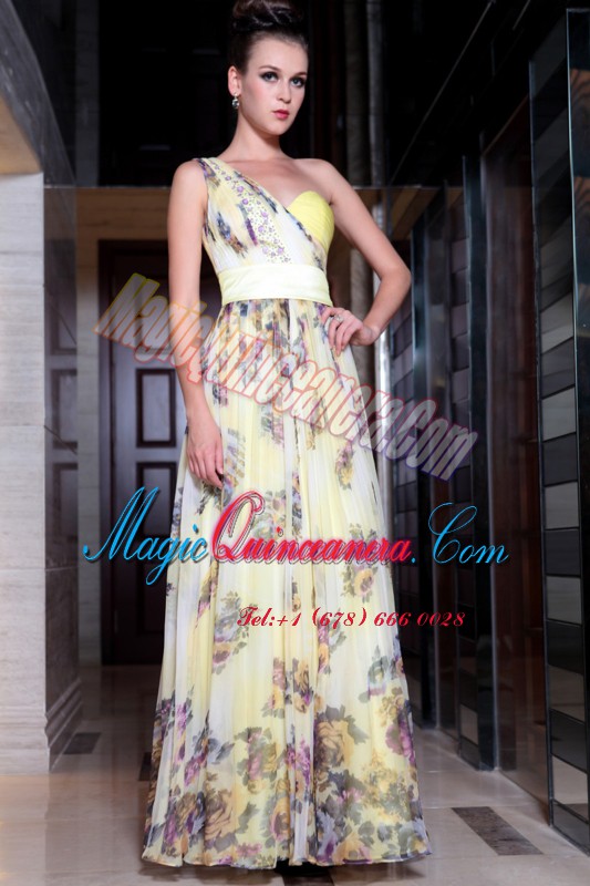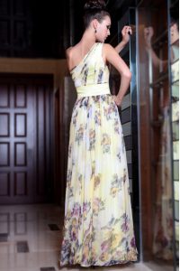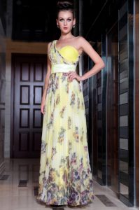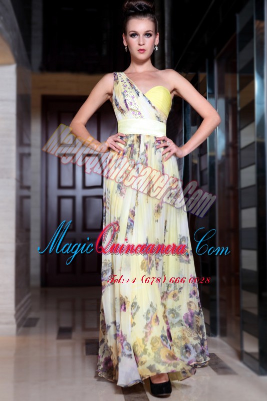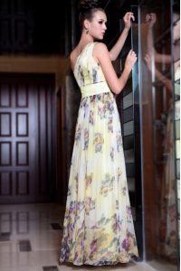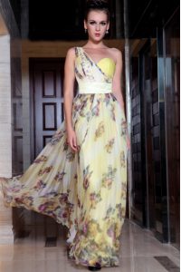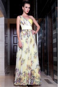 One Shoulder Floor Length Side Zipper Homecoming Dress Light Yellow for Prom and Party with Beading and Pattern