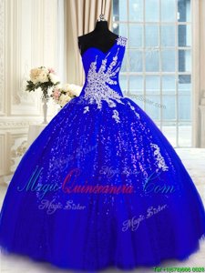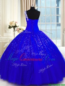 One Shoulder Sleeveless Lace Up Ball Gown Prom Dress Royal Blue Tulle and Sequined
