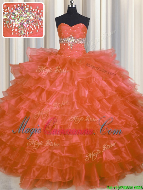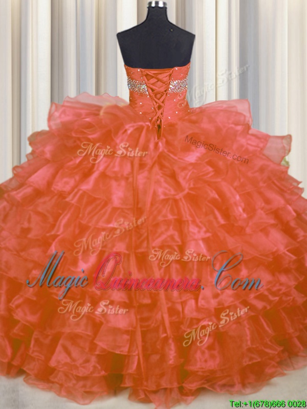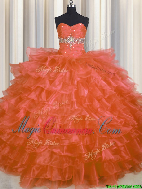 Orange Red Ball Gowns Organza Sweetheart Sleeveless Beading and Ruffled Layers Floor Length Lace Up Quinceanera Dresses
