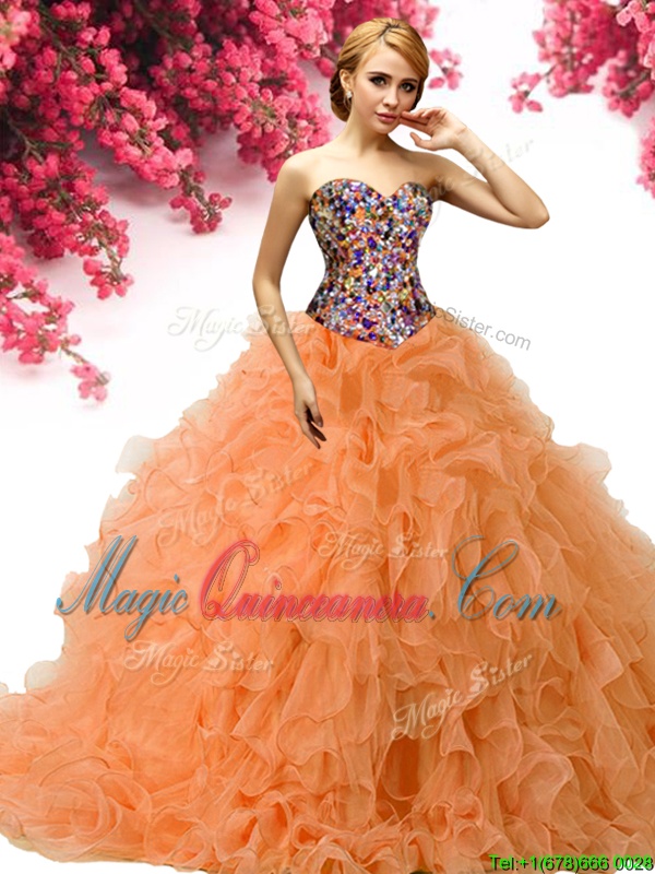 , Orange Sleeveless Floor Length Beading and Ruffles Lace Up Quinceanera Gown