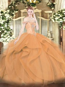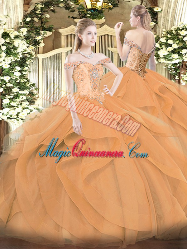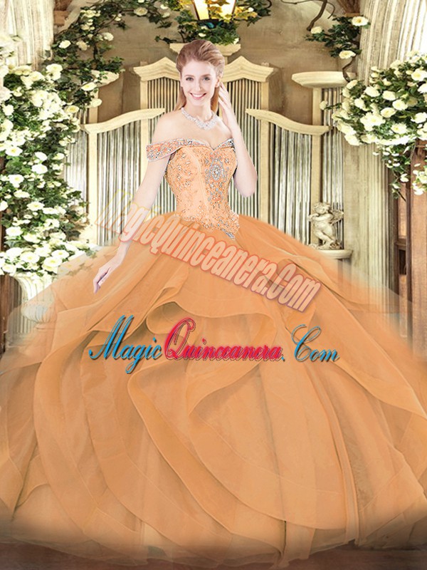 Orange Sleeveless Floor Length Beading and Ruffles Lace Up Quinceanera Gowns
