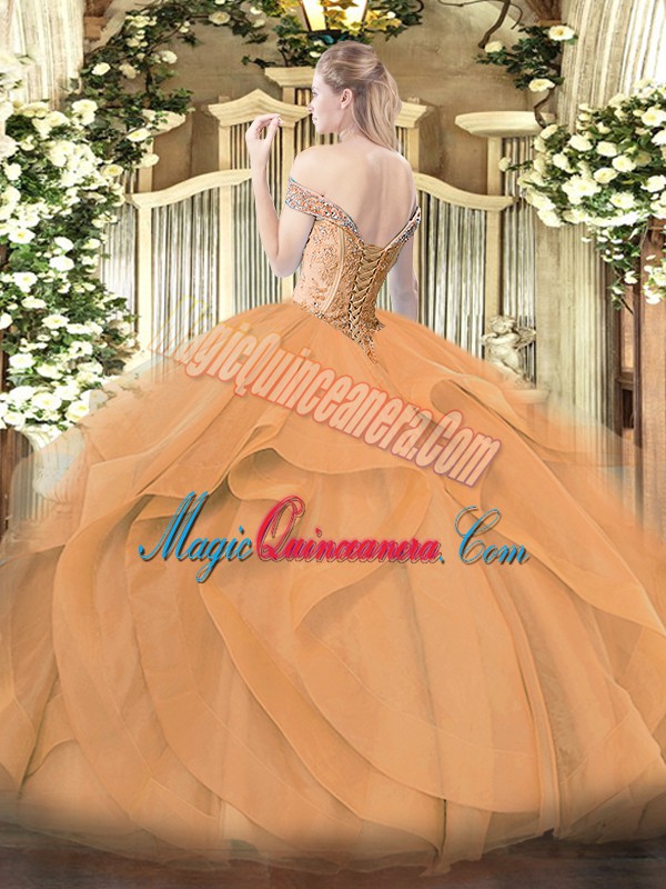 , Orange Sleeveless Floor Length Beading and Ruffles Lace Up Quinceanera Gowns