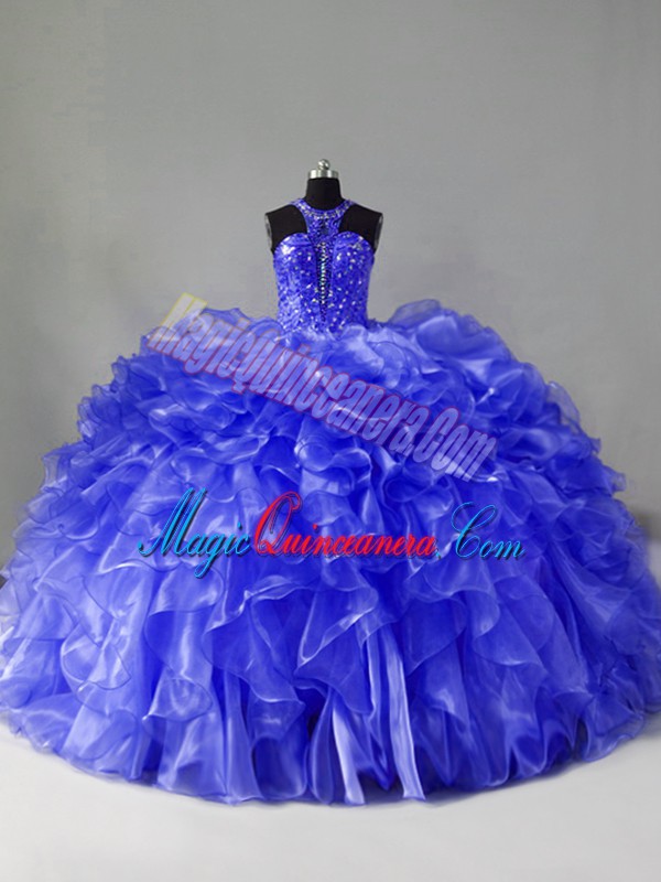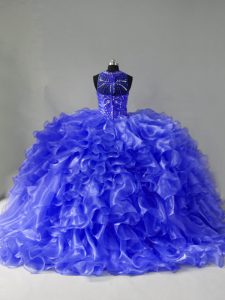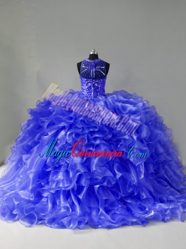 Organza Halter Top Sleeveless Brush Train Zipper Beading and Ruffles Quinceanera Gowns in Blue