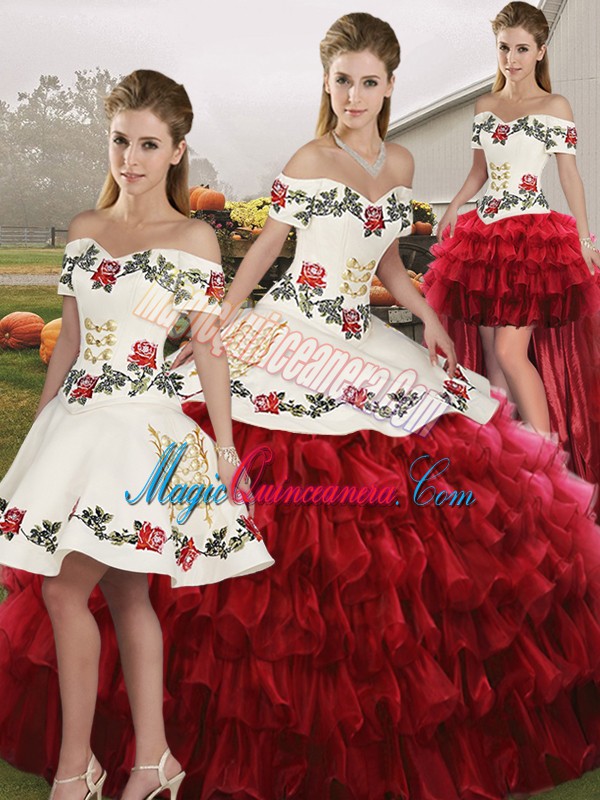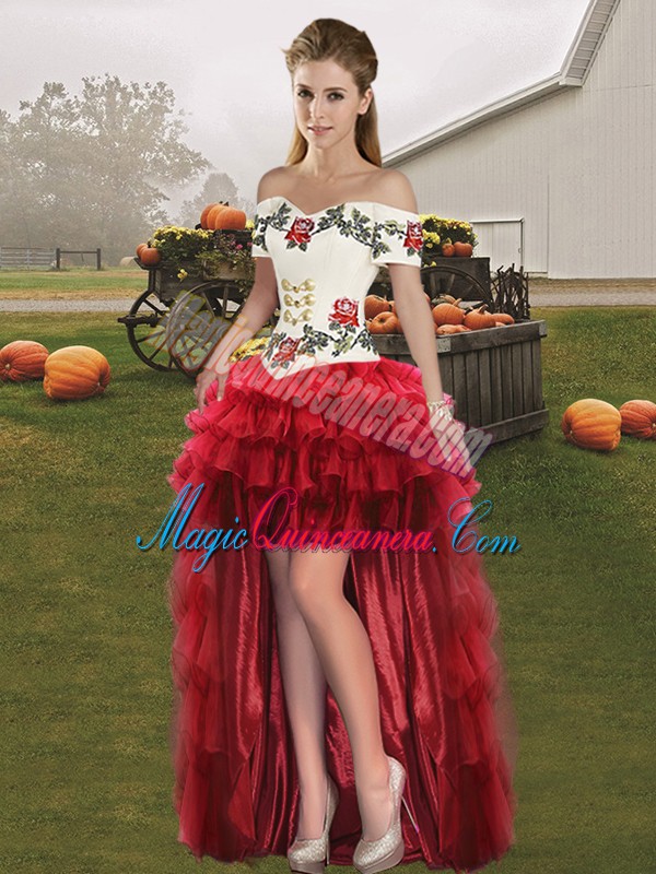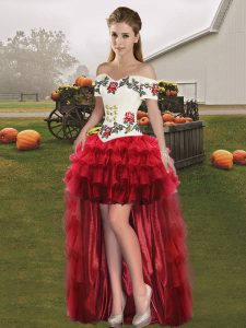 Organza Off The Shoulder Sleeveless Lace Up Embroidery and Ruffled Layers Sweet 16 Quinceanera Dress in Wine Red