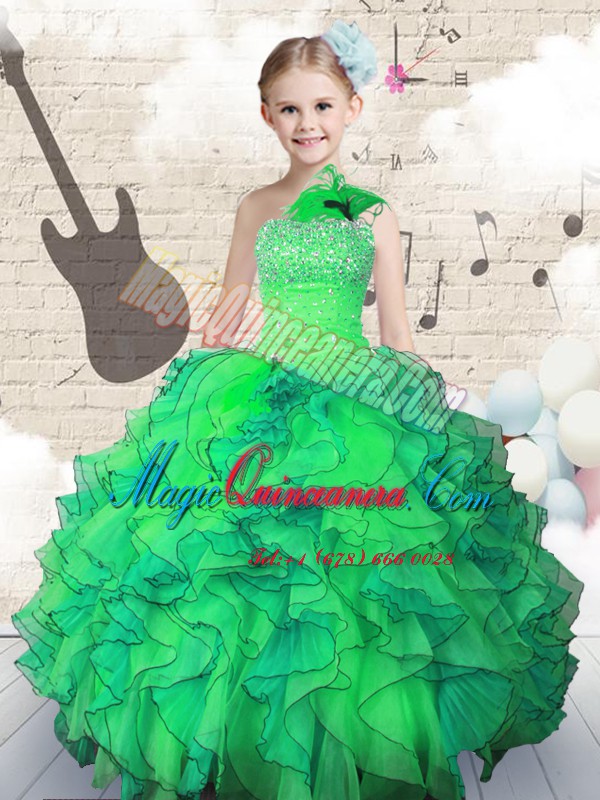 Organza One Shoulder Sleeveless Lace Up Beading and Ruffles Little Girls Pageant Dress in Green