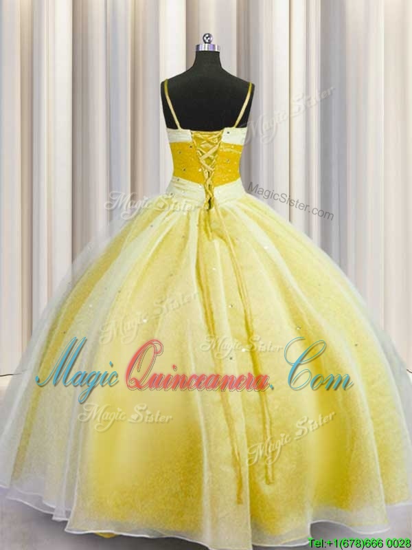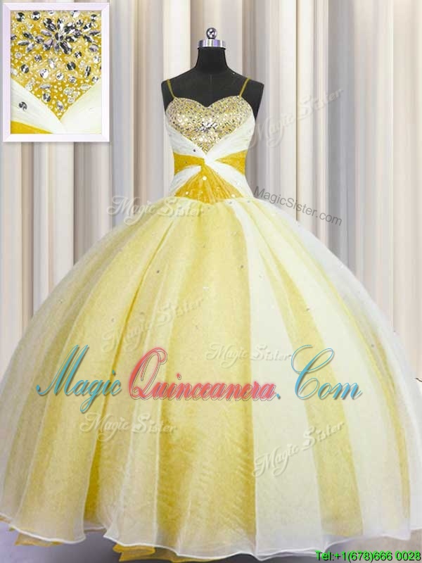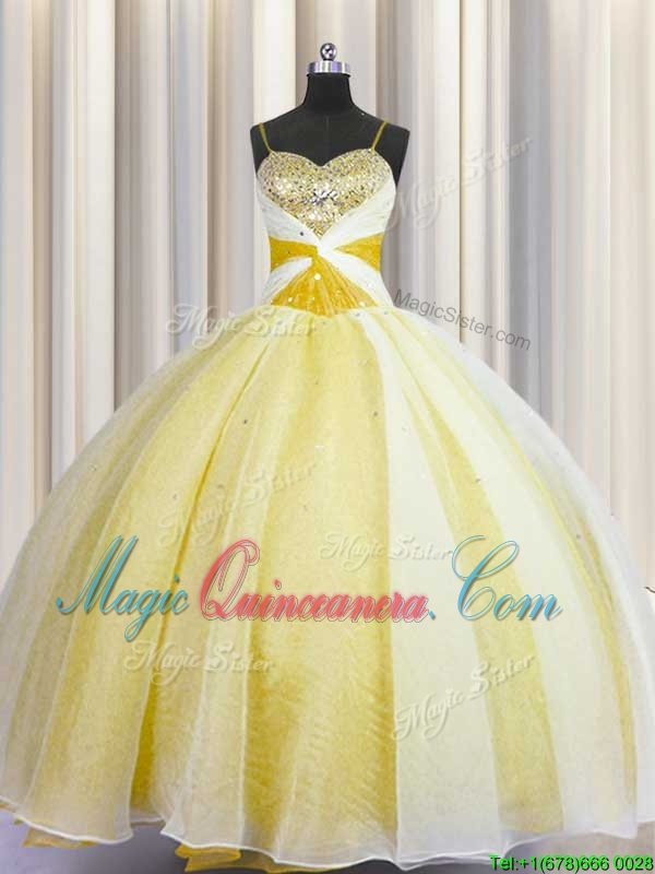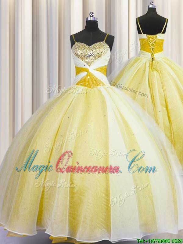 Organza Spaghetti Straps Sleeveless Lace Up Beading and Ruching Quinceanera Gown in Yellow