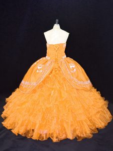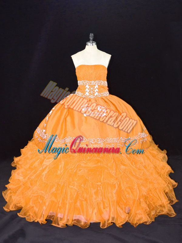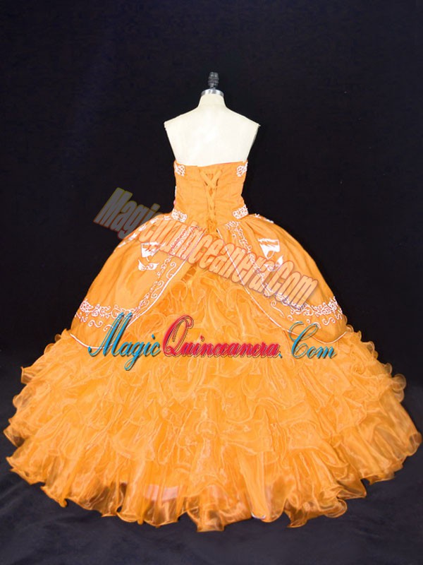Organza Strapless Sleeveless Lace Up Embroidery and Ruffles Sweet 16 Dresses in Gold