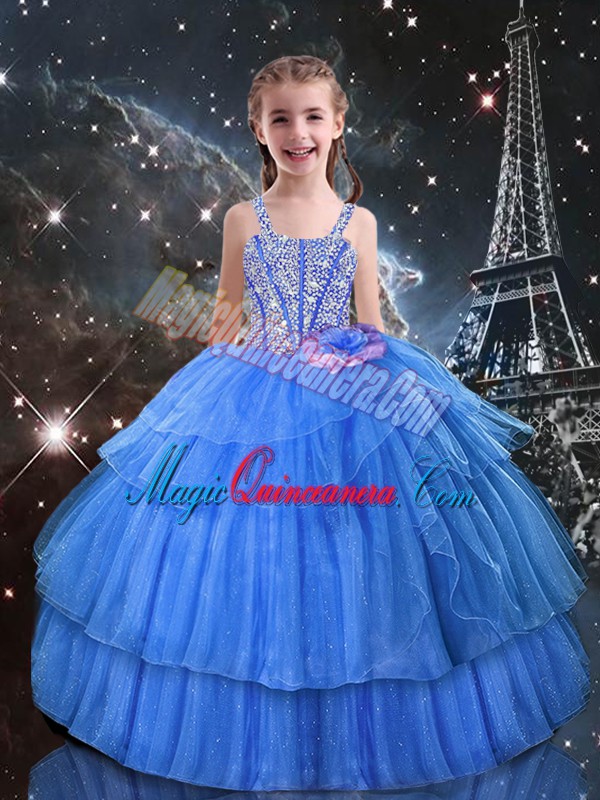 Organza Straps Sleeveless Lace Up Beading and Ruffled Layers Little Girl Pageant Dress in Light Blue