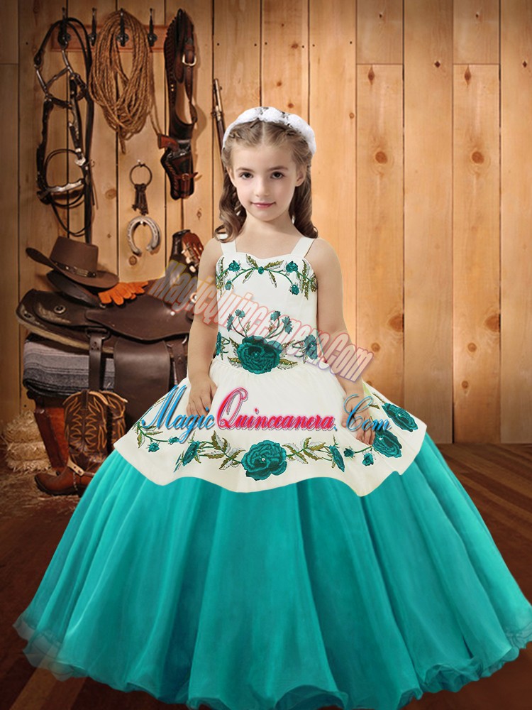 , Organza Straps Sleeveless Lace Up Embroidery Pageant Gowns For Girls in Aqua Blue