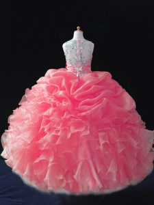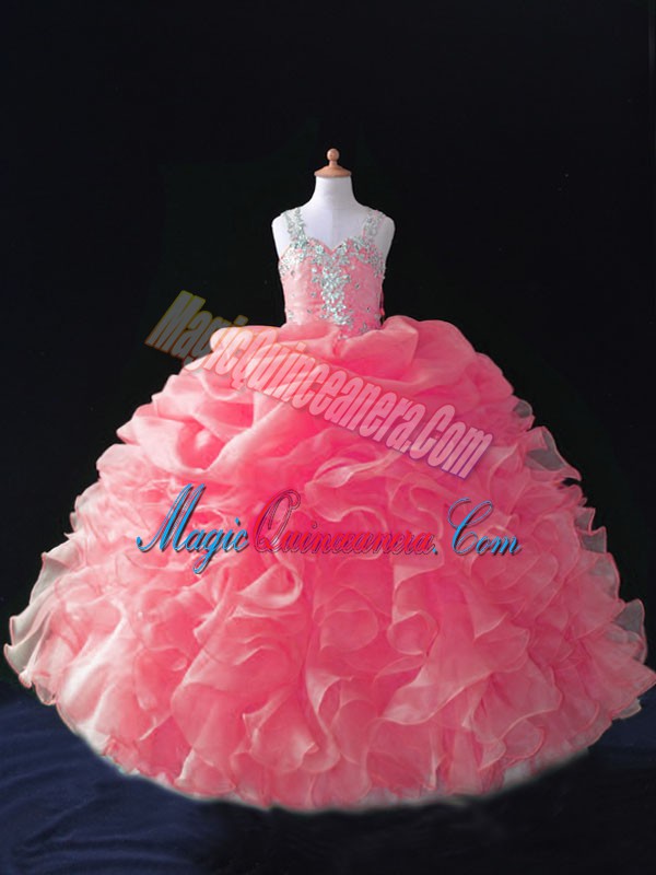 Organza Straps Sleeveless Zipper Beading and Ruffles and Pick Ups Little Girls Pageant Dress Wholesale in Coral Red - Magic Quinceanera