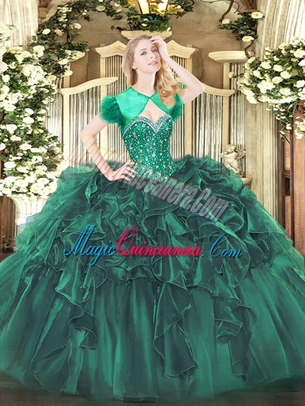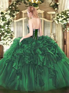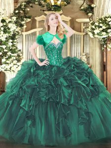 Organza Sweetheart Sleeveless Lace Up Beading and Ruffles Quinceanera Gown in Dark Green